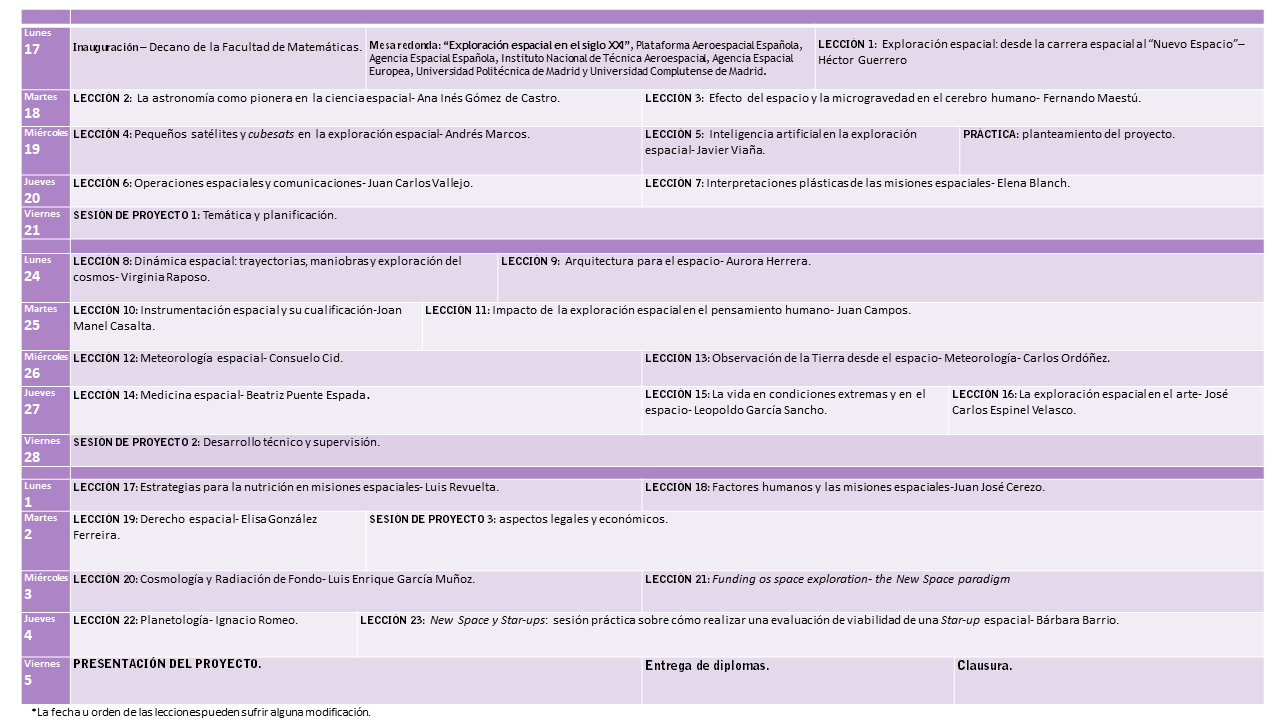 Las lecciones durarán entre 60-120 minutos y habrá 30 minutos de descanso durante la tarde. Las clases de prácticas tendrán una duración equivalente. (*) Las clases de taller se dedicarán al diseño de un proyecto espacial básico, pero completo en todos los aspectos que tienen que ver con los temas abordados en el curso, que será desarrollado por los alumnos del curso tutorizados por los profesores que imparten las asignaturas. ![]() | ||