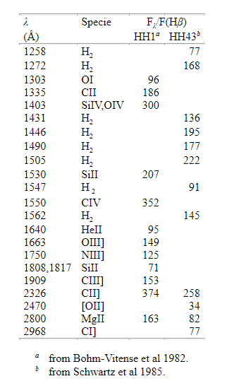 The lines observed in the UV spectra of the HHOs depend on the degree of excitation of the nebulosity. High excitation objects like HH1 or HH2 produce strong emission lines of CIV (UV1), OIII](1663), SiIII](1892) and CIII](1909) in the short wavelength range (1200-2000 Å) (Ortolani & D’Odorico 1980, Bohm et al 1981, Brugel et al 1982, Bohm-Vitense et al 1982). However, low excitation objects like HH43 or HH47 are characterized by the presence of the H2 Lyman band emission lines (Schwartz, 1983, Schwartz et al 1985). In the long wavelength range (2000-3200 Å) lines of CII](2326), [OII](2470) and MgII (UV1) are observed in both types of objects (Bohm et al 1981, Bohm-Vitense et al 1982, Schwartz et al 1985, Cameron & Liseau 1990). The strength of these lines relative to Hβ is indicated in Table 1 for two prototypical objects: HH1 and HH43