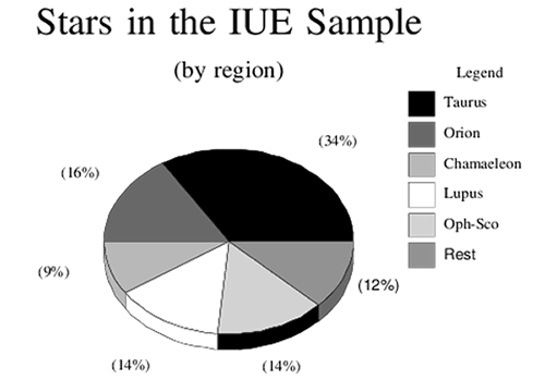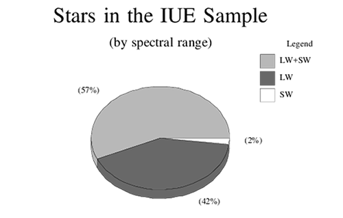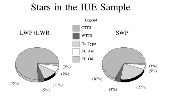 Most of the sources observed with IUE are CTTS. Preferred spectral types. Statistics by cameras. Enough data for variability studies only for few sources. Regions of star formation (best studied: Taurus, Lupus and Orion).